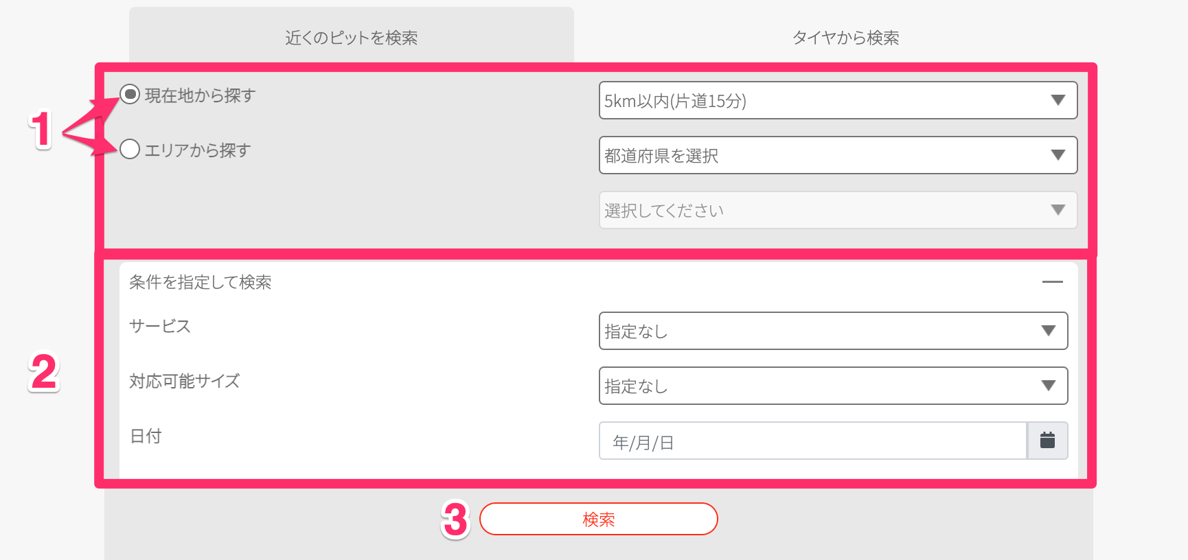 1. 【現在地から探す】または【エリアから探す】を選択し、条件を入力する